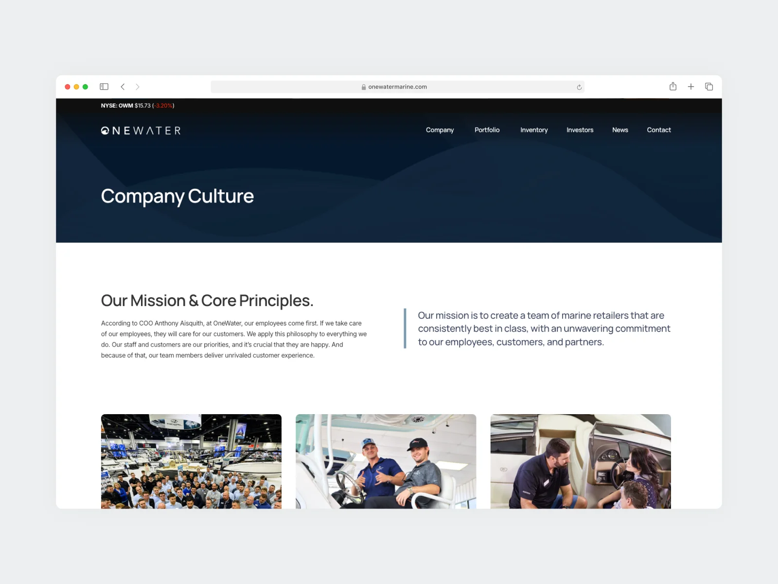 OneWater Marine is one of the largest and fastest growing premium boat retailers in the United States. With 90+ locations across the United States & Europe, the company offers a broad range of products and services and has diversified revenue streams, which include the sale of new and pre-owned boats, parts and accessories, and more. I worked with the senior leadership team to re-develop their outdated Wix site into a modern experience to better inform investors of the benefit of partnering with OneWater.
